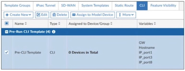 A pre-run CLI template that is used in zero-touch provisioning (ZTP) and low-touch provisioning (LTP) with FortiManager is shown.
