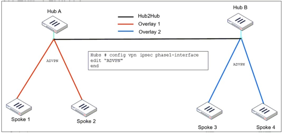 Refer to the exhibit, which shows the ADVPN IPsec interface representing the VPN IPsec phase 1 from Hub A to Spoke 1 and Spoke 2, and from Hub to Spoke 3 and Spoke 4.