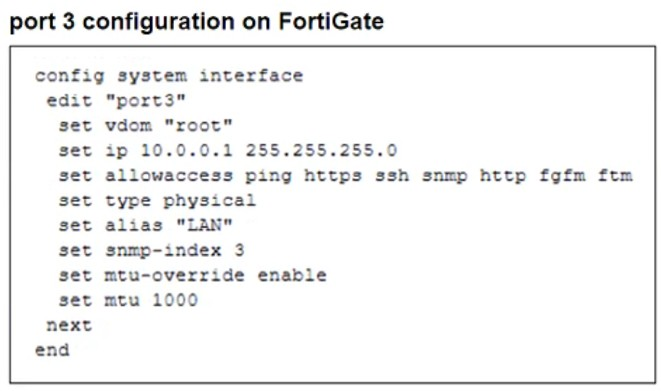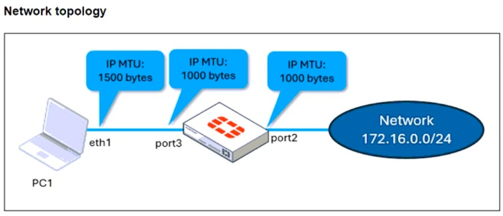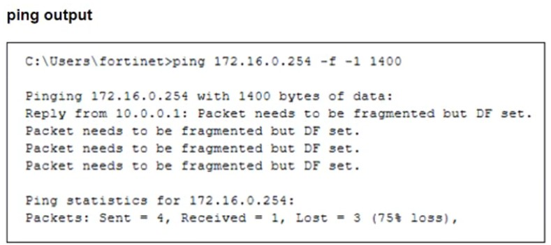 A. Option ip.flags.mf must be set to enable on FortiGate. The user has to adjust the ping MTU to 1000 to succeed.